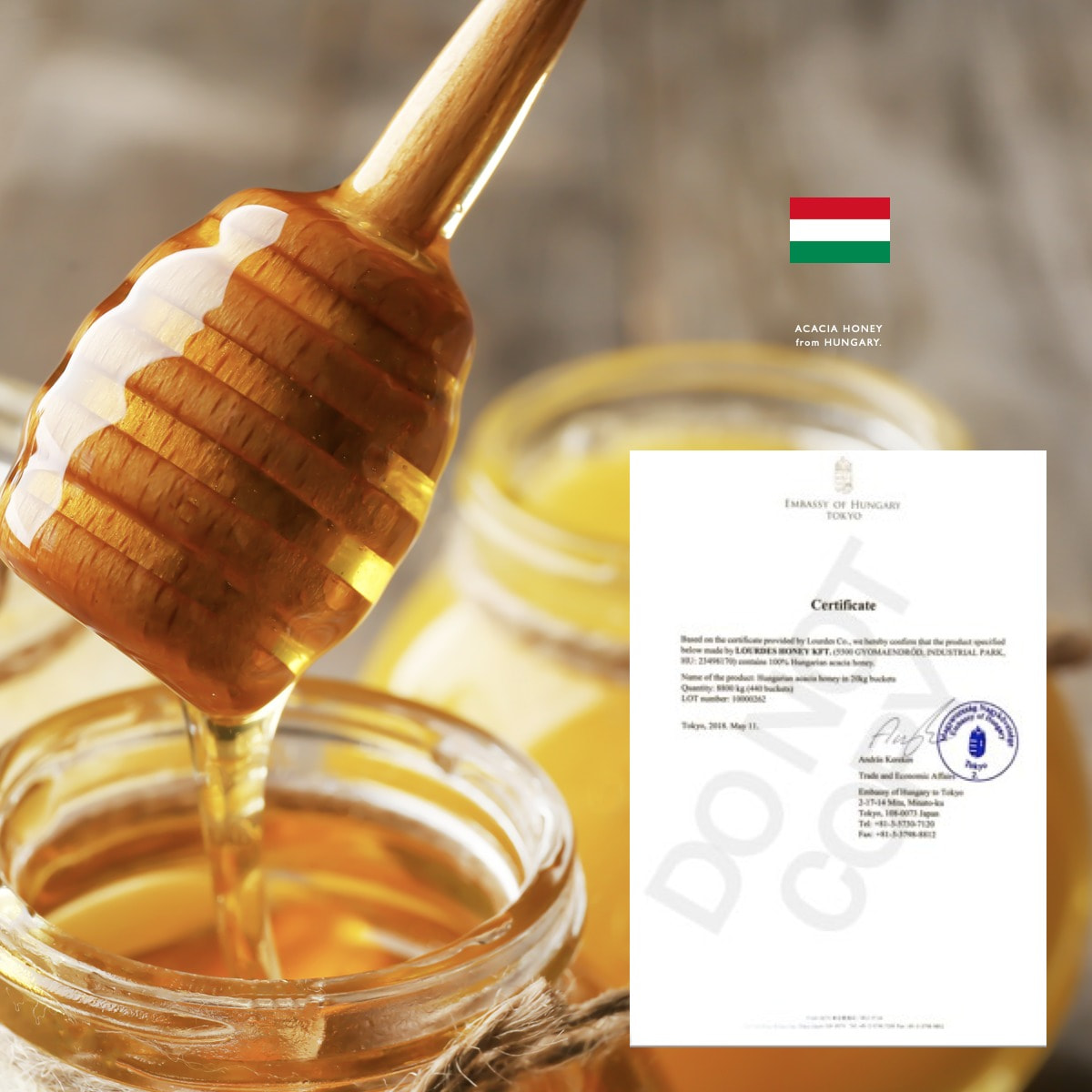 マイハニーは、ハンガリー大使館から日本で唯一(2018年7月現在)認証を受けました。私たちが「美味しい」はもちろん「安心」にも心を込めて取り組んでいる証のひとつです。