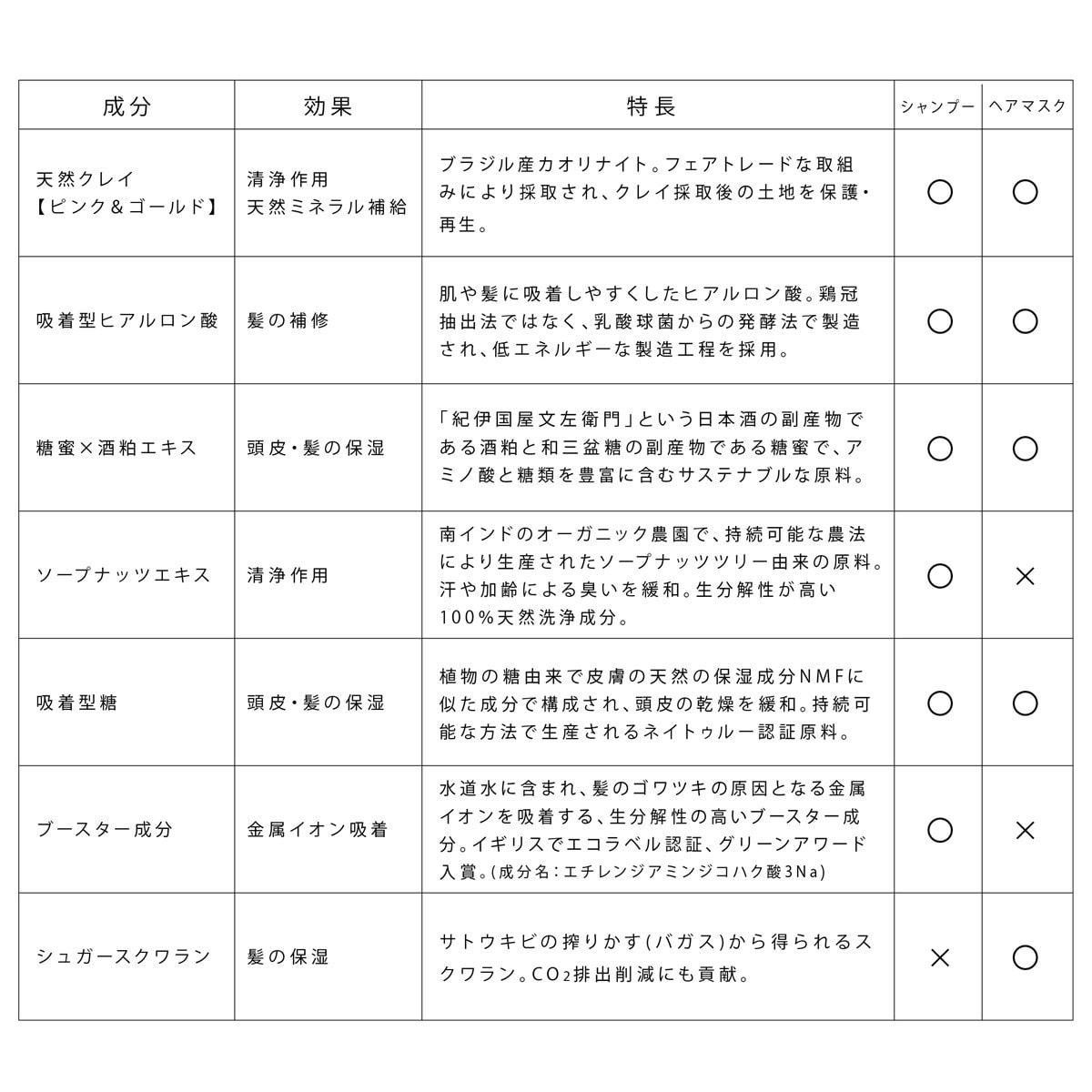 【シャンプー】水、コカミドプロピルベタイン、オレフィン(C14-16)スルホン酸Na、ラウロイルメチルアラニンNa、コカミドメチルMEA、グリセリン、カオリン、酒粕エキス、トウミツ、異性化糖、ヒアルロン酸ヒドロキシプロピルトリモニウム、サピンヅストリホリアツス果実エキス、エチレンジアミンジコハク酸3Na、塩化Na、ポリクオタニウム-10、クエン酸、デシルグルコシド、PEG-40水添ヒマシ油、PPG-14ポリグリセリル-2エーテル、EDTA-2Na、ラウロイルグルタミン酸ジヘキシルデシル、カラメル、キハダ樹皮エキス、BG、安息香酸Na、フェノキシエタノール、香料